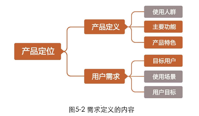 产品定义包括使用人群、主要功功能和产品特色;用户需求包含目标用户、使用场景和用户目标。其中目标用户是在使用人群细分的基础上得到的,它也在一定程度上影响了使用场景和用户目标。