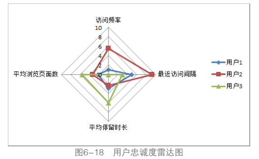 图6-18使用了表6-2中三位用户的评分数据绘制而成,能够非常形象地表现用户忠诚度在各指标上的表现情况,用户1的整体忠诚度较低,用户2在访问频率和访问间隔具有较好表现,而用户aki访问具有相对较高的参与度。使用雷达图分析用户的忠诚度主要有如下优势: