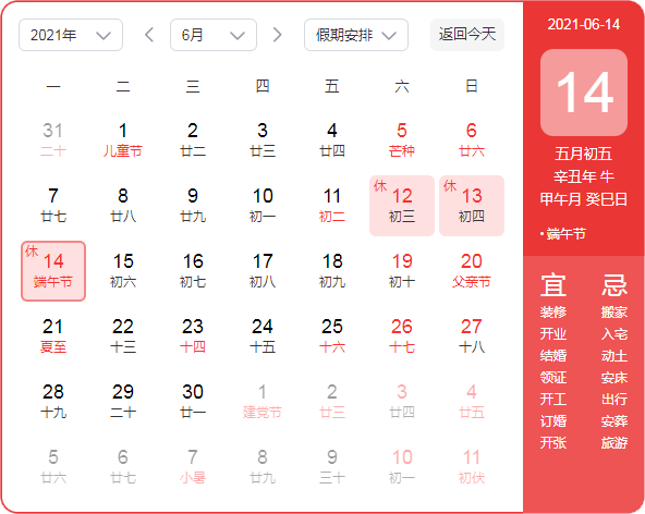 放假时间:2021年6月12日(周六)——2021年6月14日(周一),共三天。