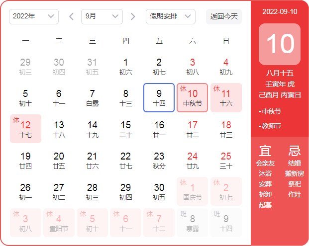 放假时间:2022年09月09日(周六)——2022年09月12日(周一),共三天。